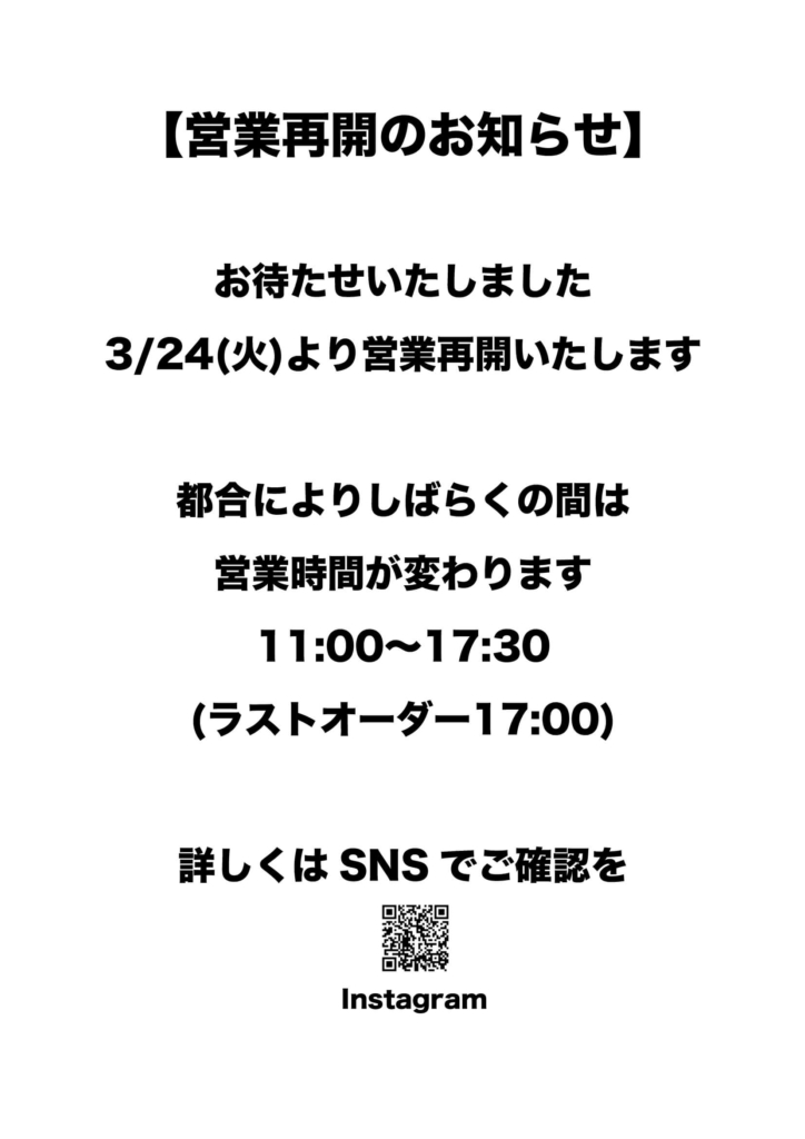 3/24(火)より営業再開いたします。都合によりしばらくの間は営業時間が変更になります。